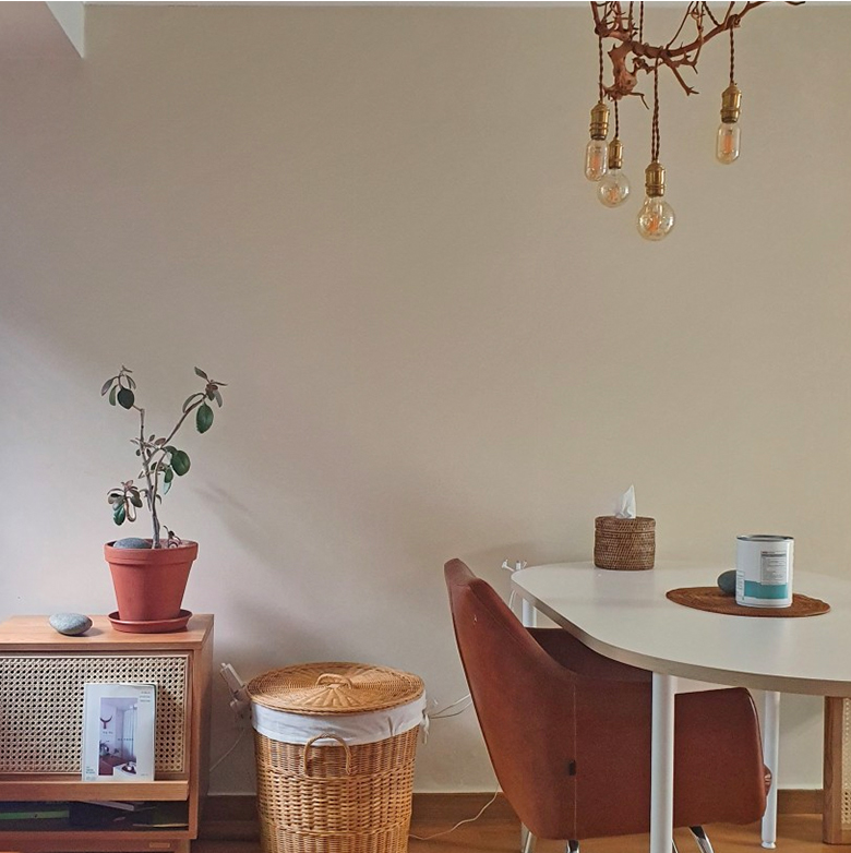 The color is a perfect choice for her because it hides stains on the walls and matches the rattan objects in her kitchen. Even the name of the color is perfectly suited for a kitchen.