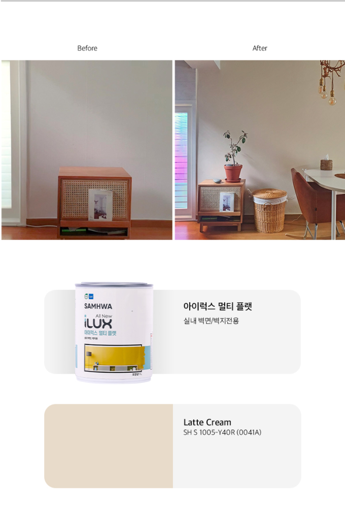 iLux Multi Flat is a collection of paints from Samhwa that is designed specifically for application onto indoor walls. The paints produce the desired colors with just one or two applications and dry quickly. The client was able to apply two coats onto her kitchen walls in the span of just 90 minutes even though it was raining outside that day.