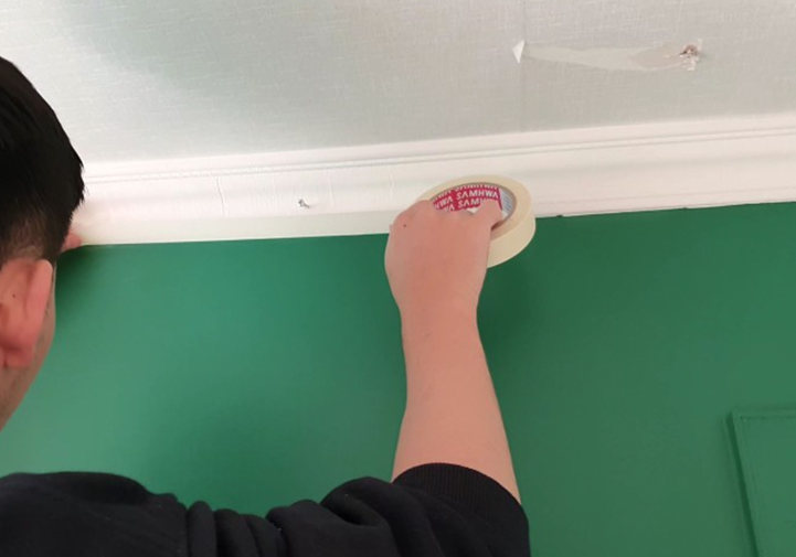 Don’t forget to do the necessary prep work to protect valuable objects and other surfaces in your room from paint. Apply the masking tape thoroughly onto all corners and edges as shown here.