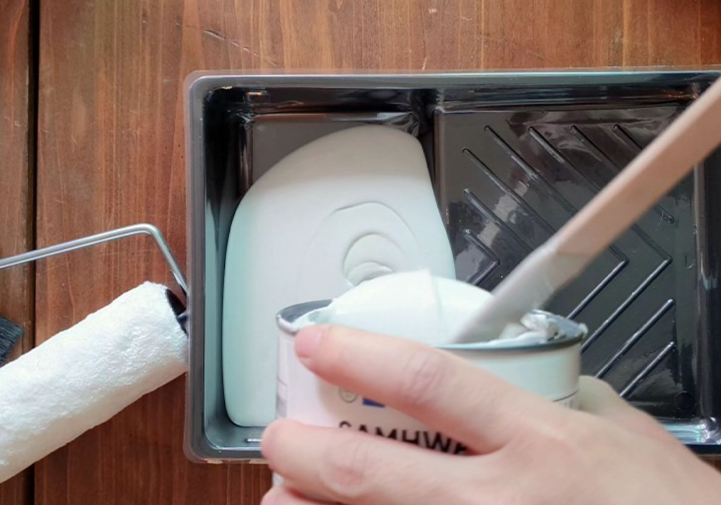 After you’re done applying the masking tape, pour an ample amount of the iLux Multi Flat paint onto the paint tray and dip your paint roller into it.