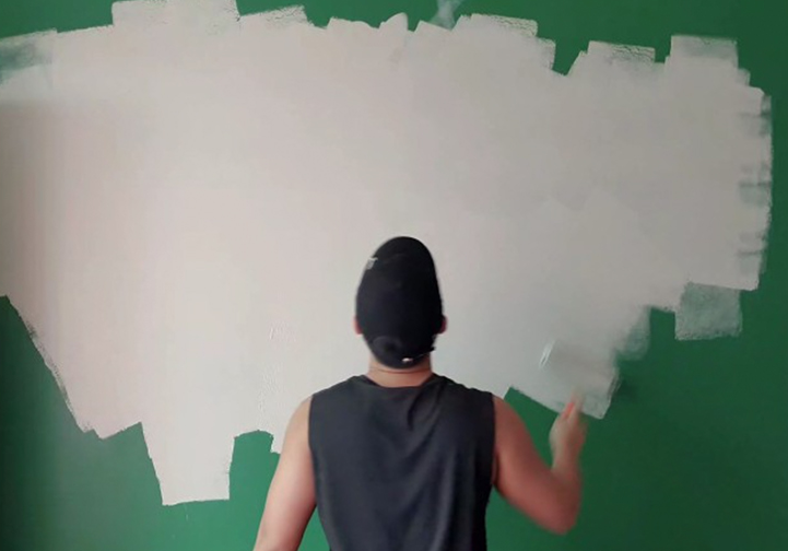 It’s not always necessary to apply the primer when you’re applying paint onto wallpaper. This time, we left out the primer altogether and things still came out perfectly, even though the wallpaper underneath was dark green in color.