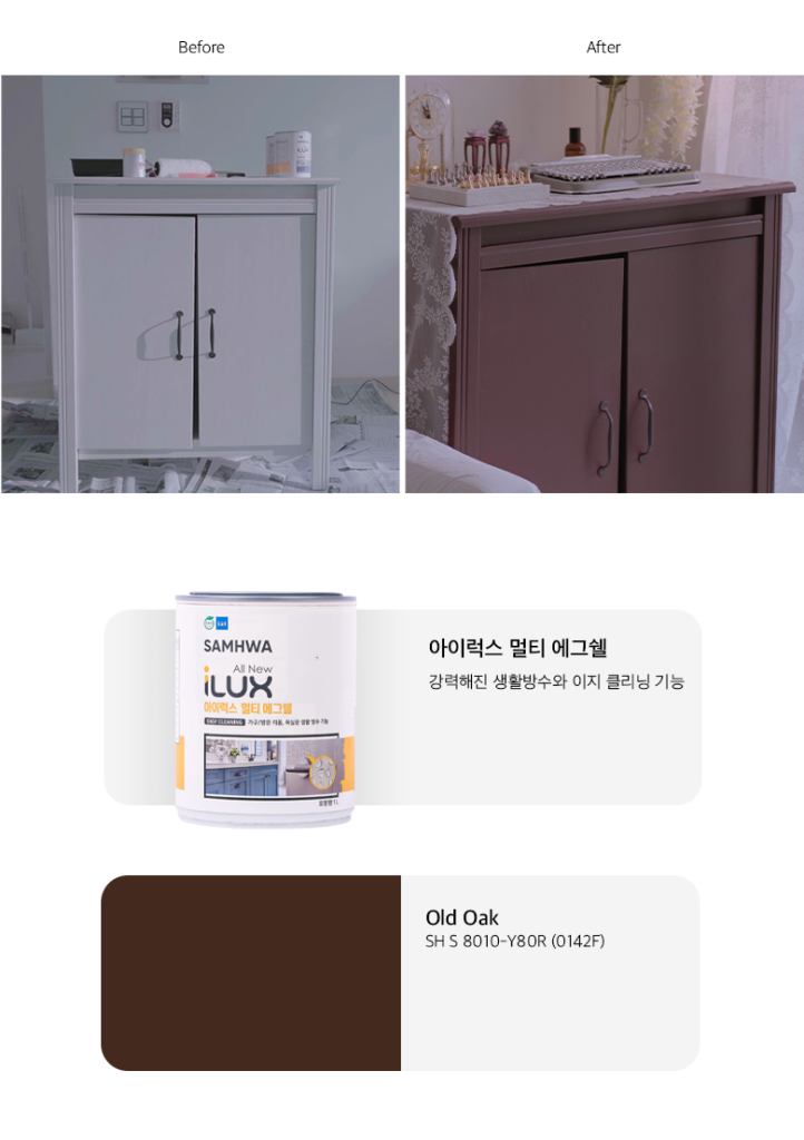 The paint I chose for my display case is from iLux Multi Eggshell, a collection of eco-friendly paints from Samhwa. I like this collection because its products are designed to be waterproof in everyday settings. You can paint them easily on moisture-prone doors, furniture, or kitchen countertops and forget about water staining or infiltrating the painted layers.
