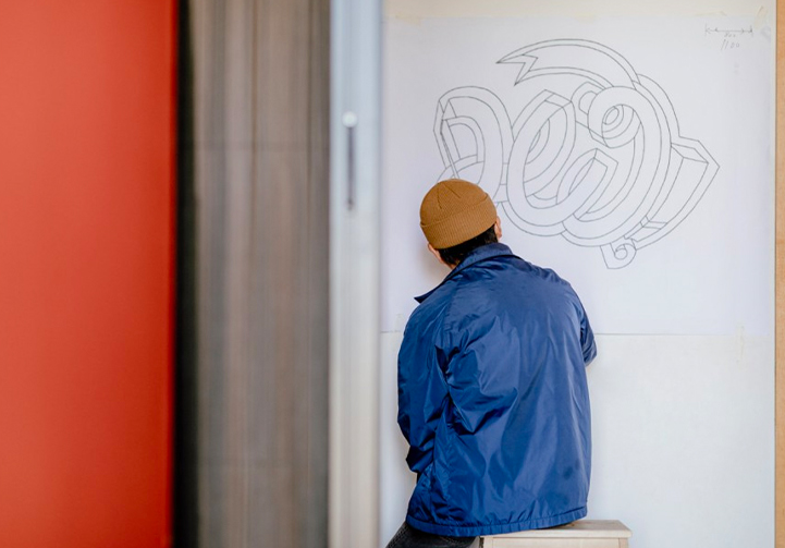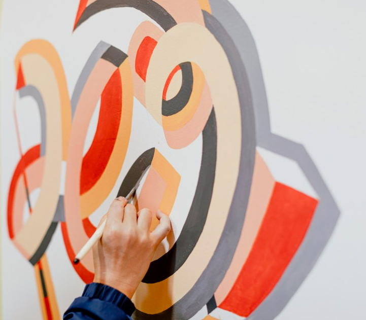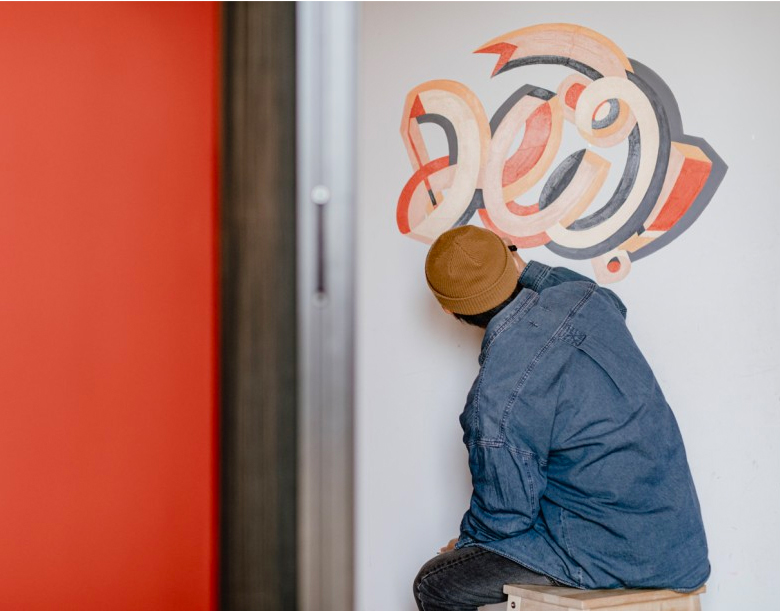 Jo didn’t want familiar lettering painted on. He came up with something truly unique and sketched it onto his wall before beginning to paint, thinking about things that would accentuate the natural flow of his newly created font.